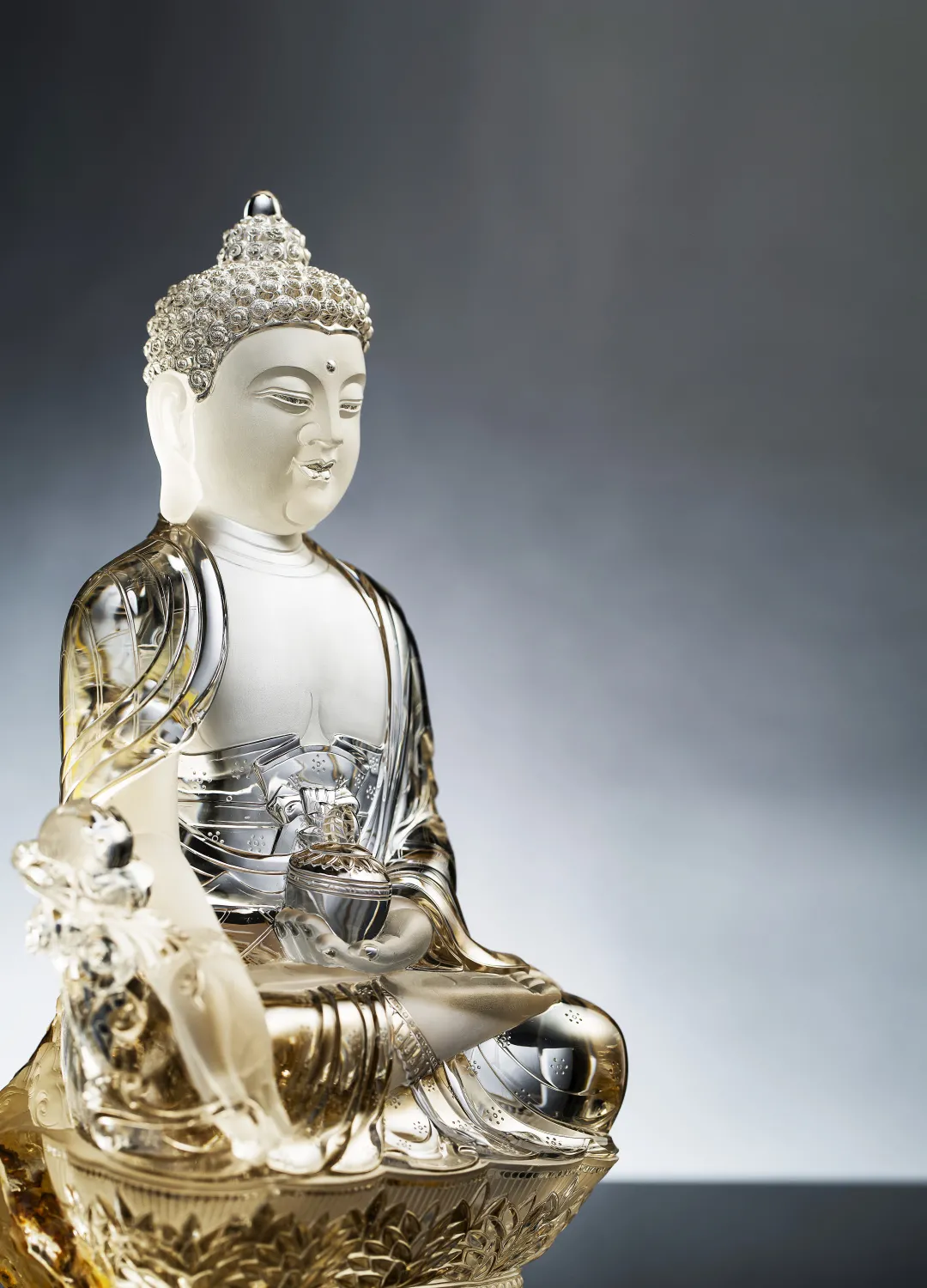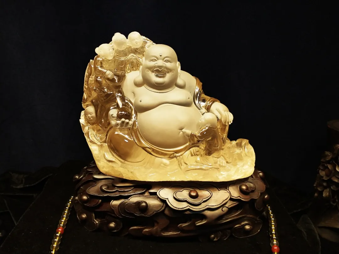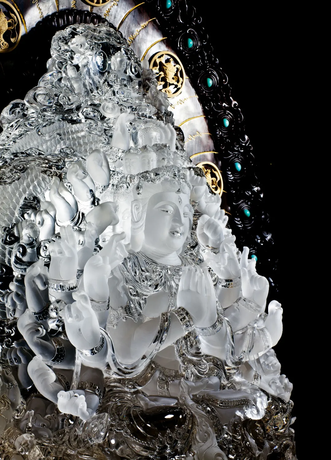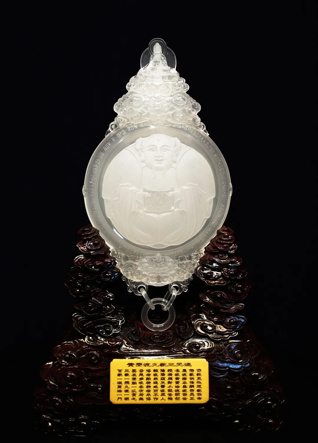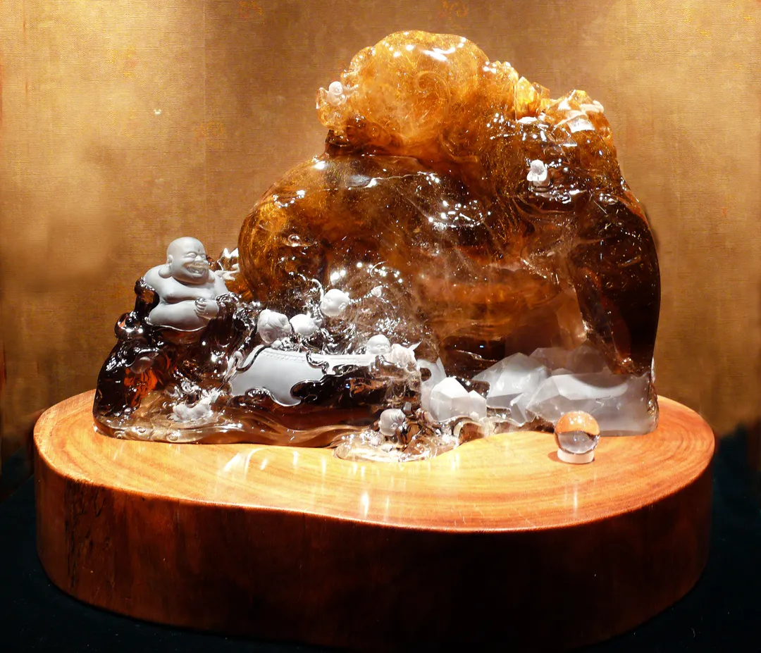 作品由天然金发黄水晶琢磨而成,水晶原料中缕缕金发如冰晶花一般,昂烈绽放,激扬璀璨,光华悦目。作品整体高233cm,宽60cm,厚50cm,是河南省应汶玉文化研究院全院研创人员耗时16年的倾心巨作,灵感取自佛教盛典“灵山法会”。作品将琢磨技艺与自然晶灵完美契合,刻画的菩萨、灵童,或肃穆站立,或怡然盘坐,或经行辩机,或嬉戏斗禅,皆是笑意融融,展现出东方文化艺术的深远意境。