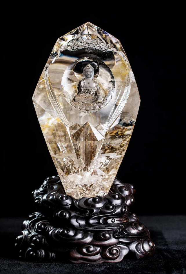 作品采用天然发晶水晶雕刻而成,水晶整体状似一颗大宝钻,其内部天然形成五种颜色的发丝,整齐排列,呈现出迸发向上的形状,十分稀有。作者为最大保留材质的原料美,而采用了大量留白手法,只在材料上半部雕琢佛像,与水晶材质的独特之处完美结合,营造出无边的气势。