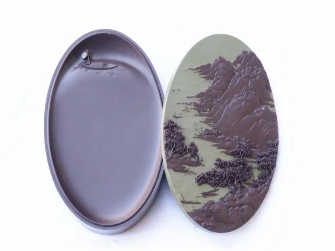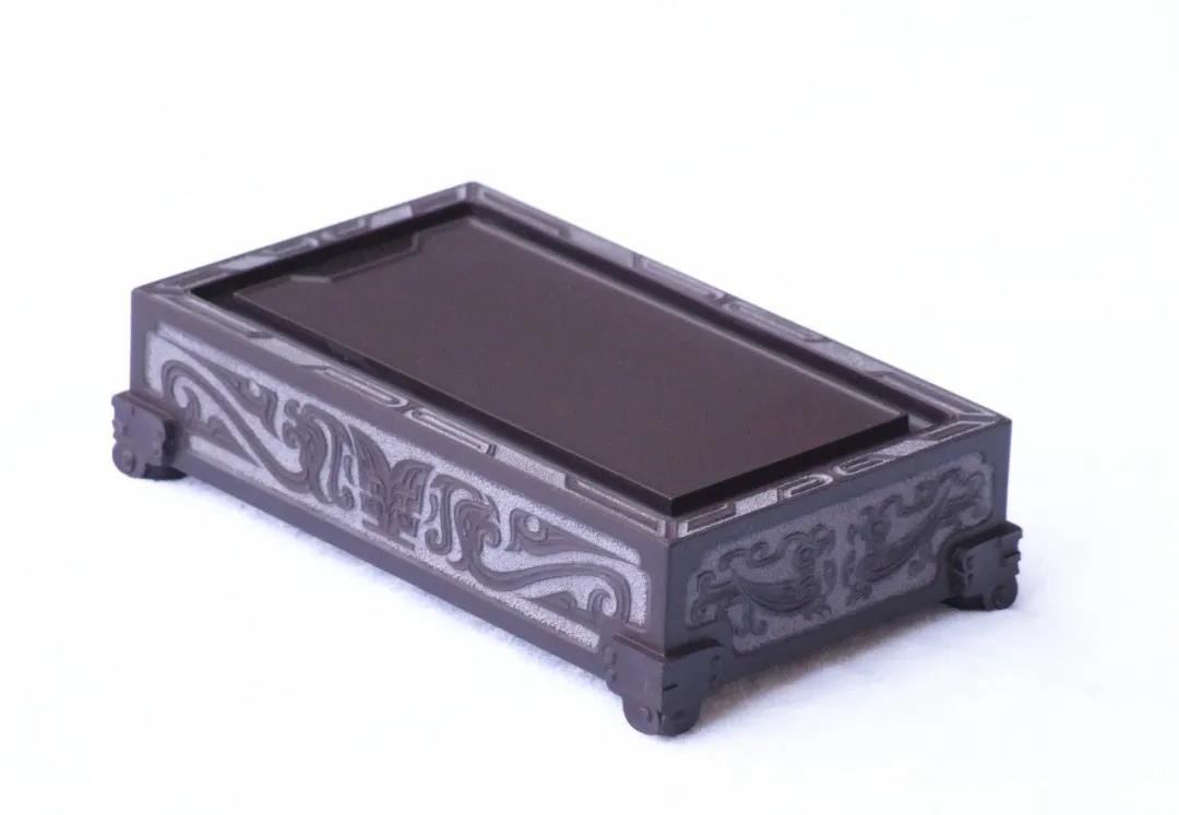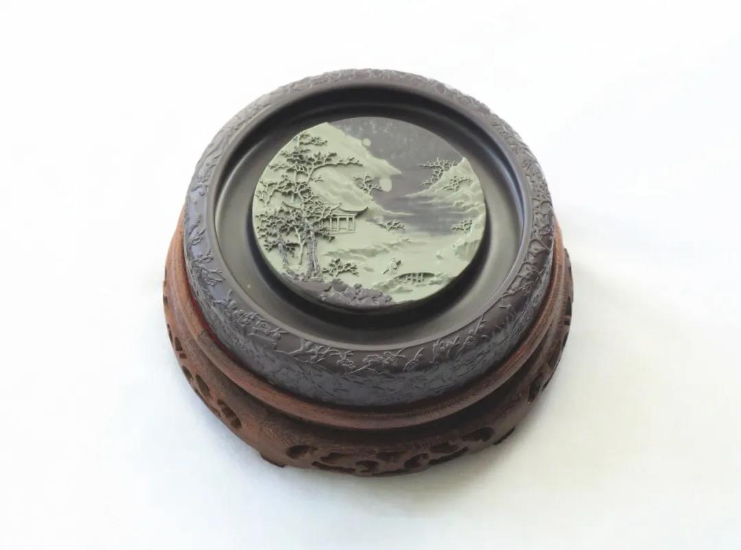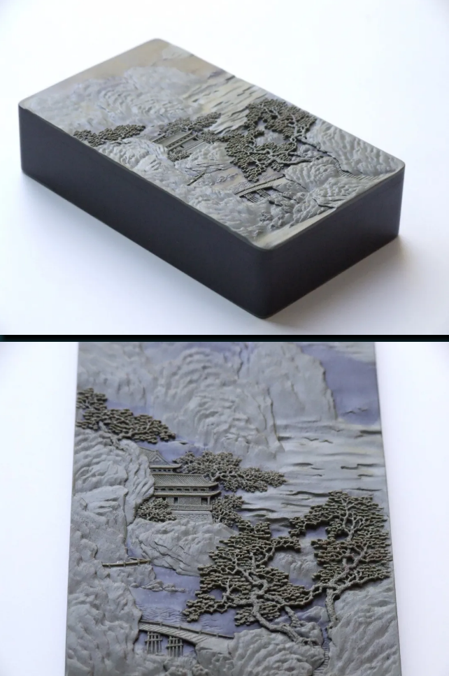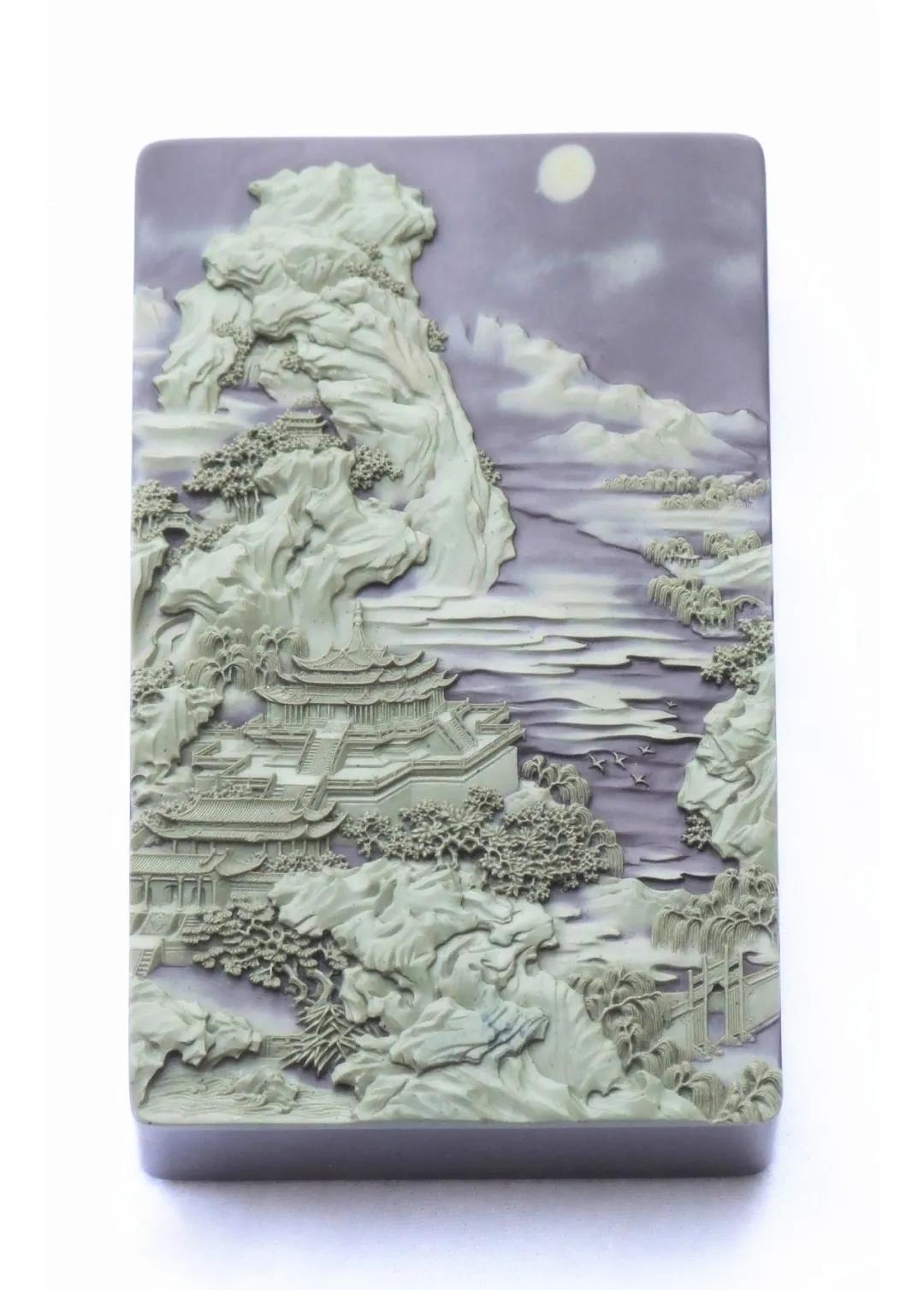 主砚与砚盖均采用贺兰石老坑砚石,石质细腻温润,品质极佳。作品题材参荐清代画家袁江的《骊山避暑图》,整体雕刻工艺精细入微,画面栩栩如生,层次分明;主砚堂内的明月与祥云安然祥和。作品立意以小见大,在有限的空间雕刻出宏大的场景,意境深远,实用性、观赏性与艺术性俱佳。