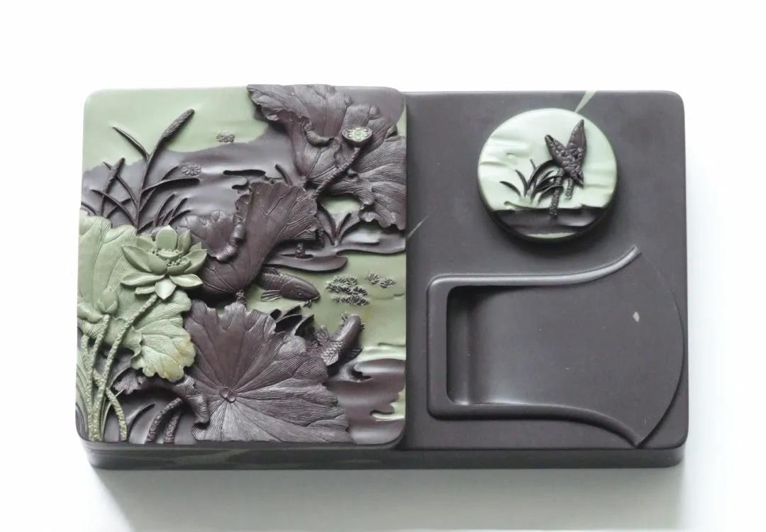 作品选用优质贺兰石老坑砚石,用料讲究。砚盖与砚底精选绿色贺兰石精雕荷叶与荷花,雕工精细,疏密有致,郁郁葱葱。以“荷气一塘”为名,寓意和气一堂,欲表达和和美美、祥和吉利之意。