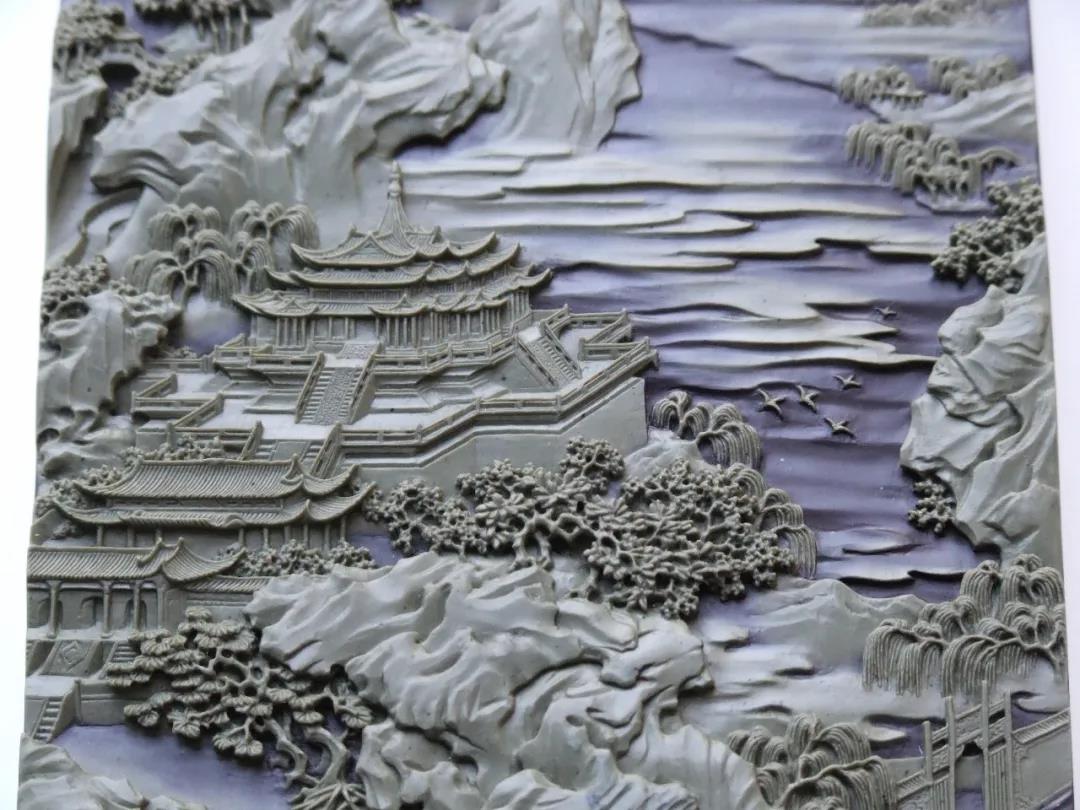 作品选用宁夏优质贺兰石,以中国传统山水为题材,刻画了一处苍松盘居、山石耸立、山间小路逶迤、溪水潺潺的清幽宁静、淡雅之致、清爽无尘的人间仙境。