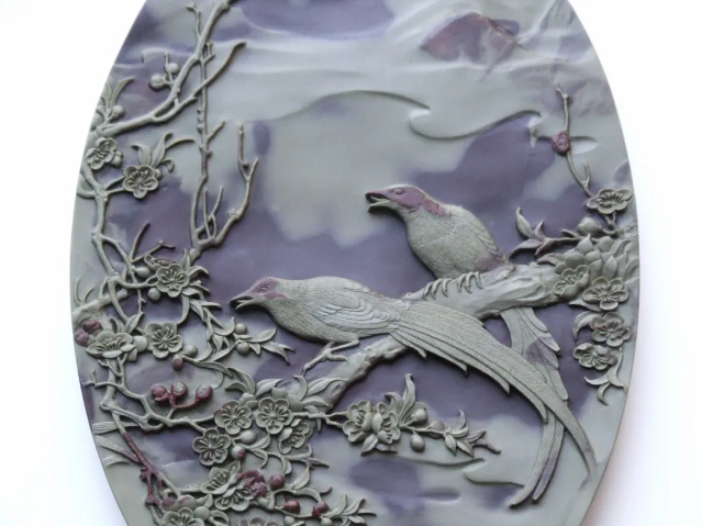 作品选用宁夏贺兰石优质砚石,主砚石质细腻嫩滑,砚盖根据砚石红钢夹绿彩的层次,雕刻了两只山雀在桃林中嘻戏的场景。贺兰石的石质在红钢和绿彩俏色的运用上得到了很好的体现,整件作品意境丰满,雕工精美,刻画了桃花盛开后生机勃发,鸟儿喜庆愉悦的欢快场景。