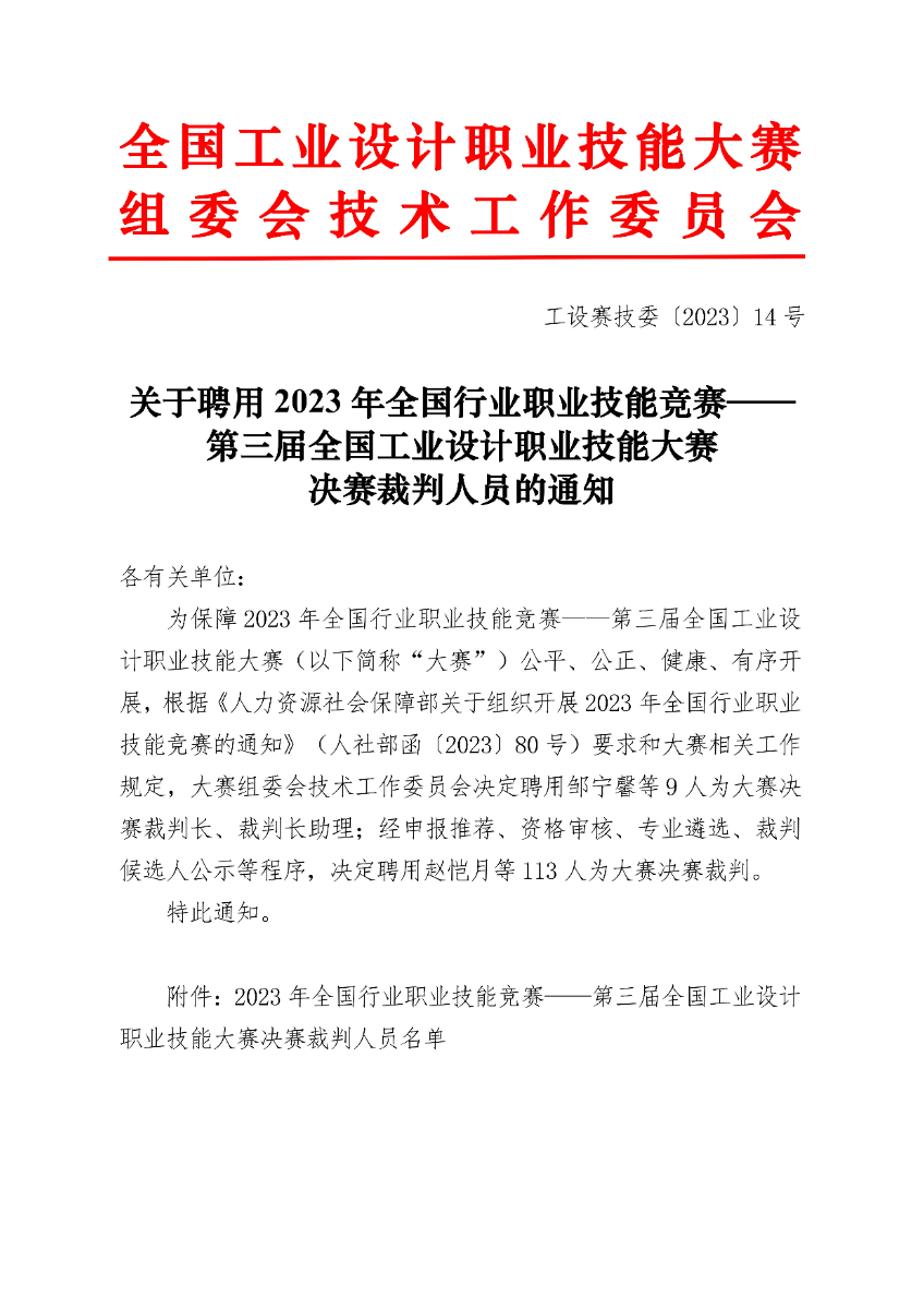 关于聘用第三届全国工业设计职业技能大赛决赛裁判人员的通知