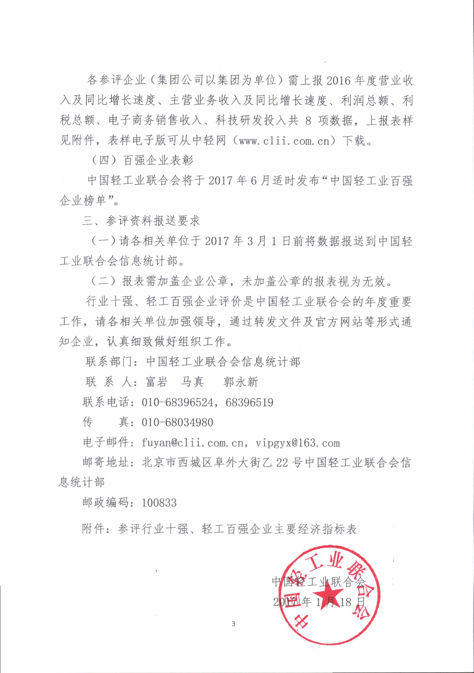 关于开展2016年度轻工行业十强、轻工业百强企业评价工作的通知