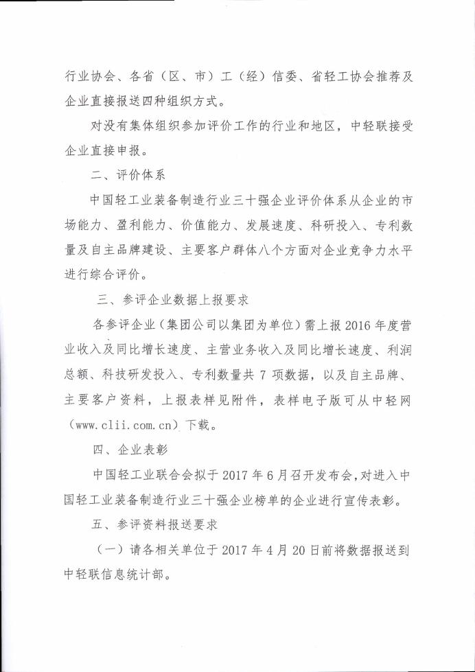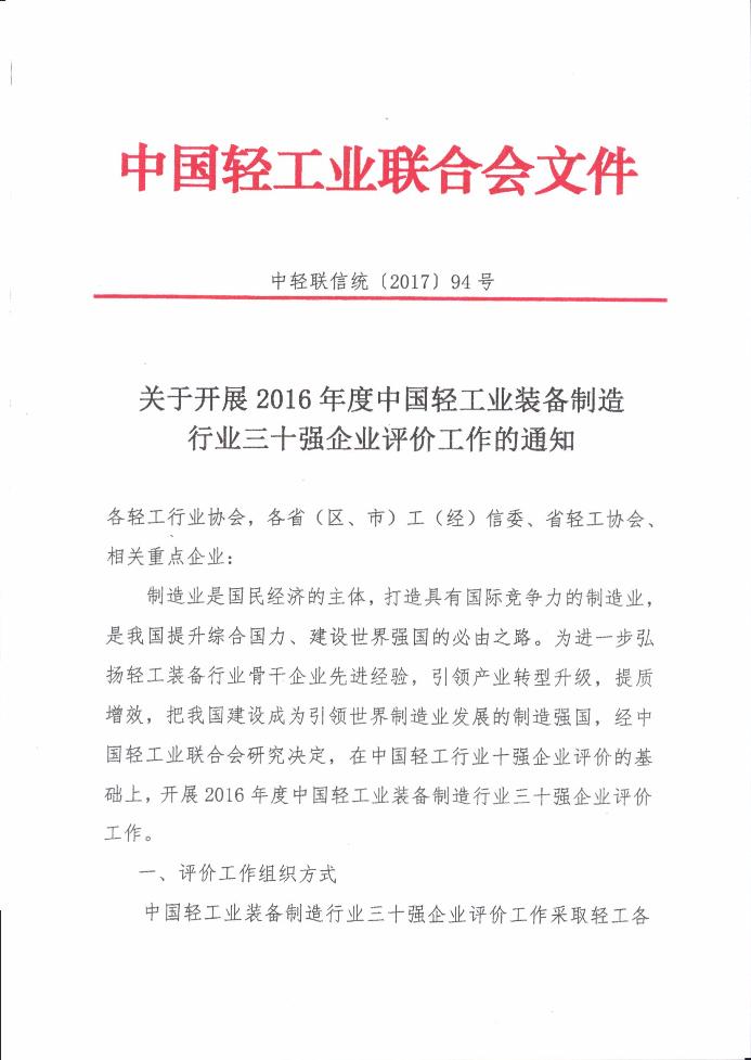 关于开展2016年度中国轻工业装备制造行业三十强企业评价工作的通知