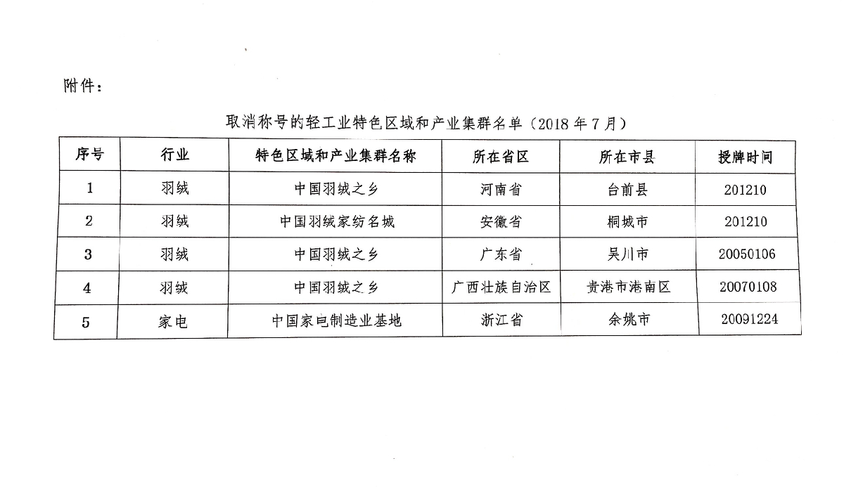 关于取消河南省台前县“中国羽绒之乡”等5个轻工业特色区域和产业集群称号的公告