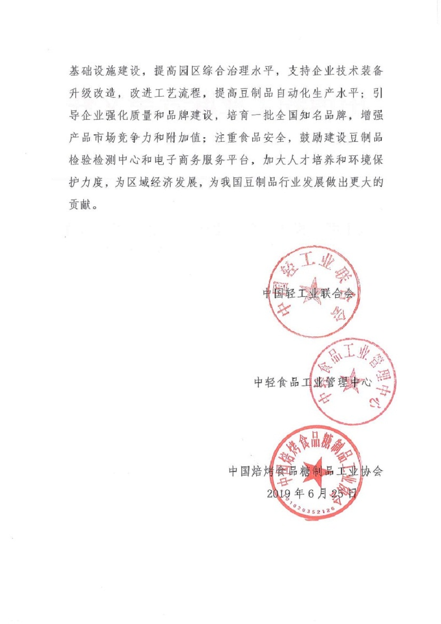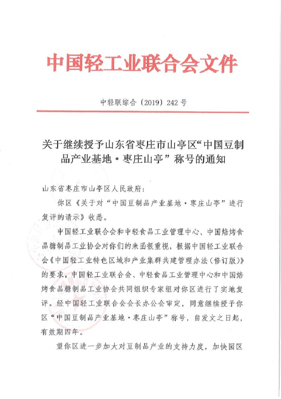 关于继续授予山东省枣庄市山亭区"中国豆制品产业基地·枣庄山亭"称号的通知