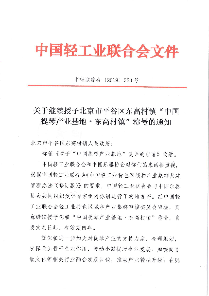 关于继续授予北京市平谷区东高村镇“中国提琴产业基地·东高村镇”称号的通知