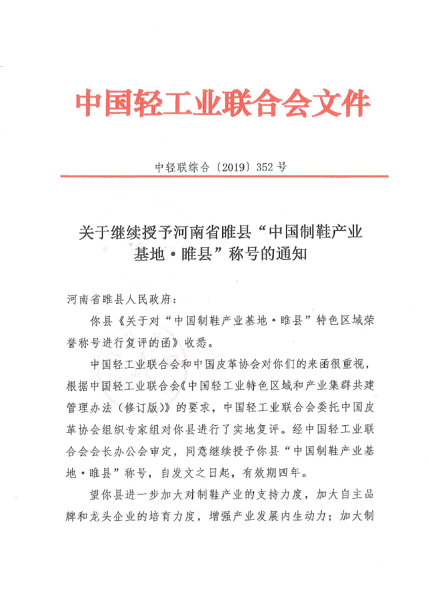 关于继续授予河南省睢县“中国制鞋产业基地·睢县”称号的通知