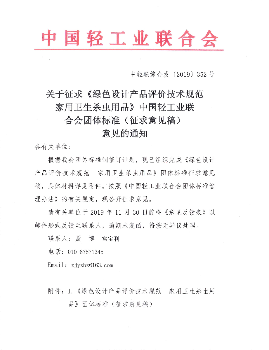 关于征求《绿色设计产品评价技术规范 家用卫生杀虫用品》bv伟德国际体育1946团体标准(征求意见稿)意见的通知