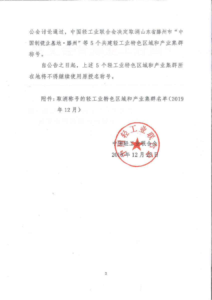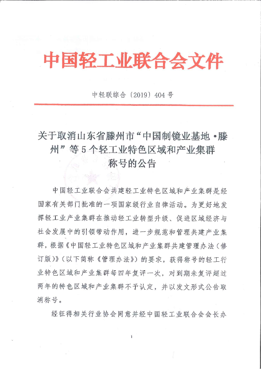 关于取消山东省滕州市“中国制镜业基地·滕州”等五个轻工业特色区域和产业集群称号的公告