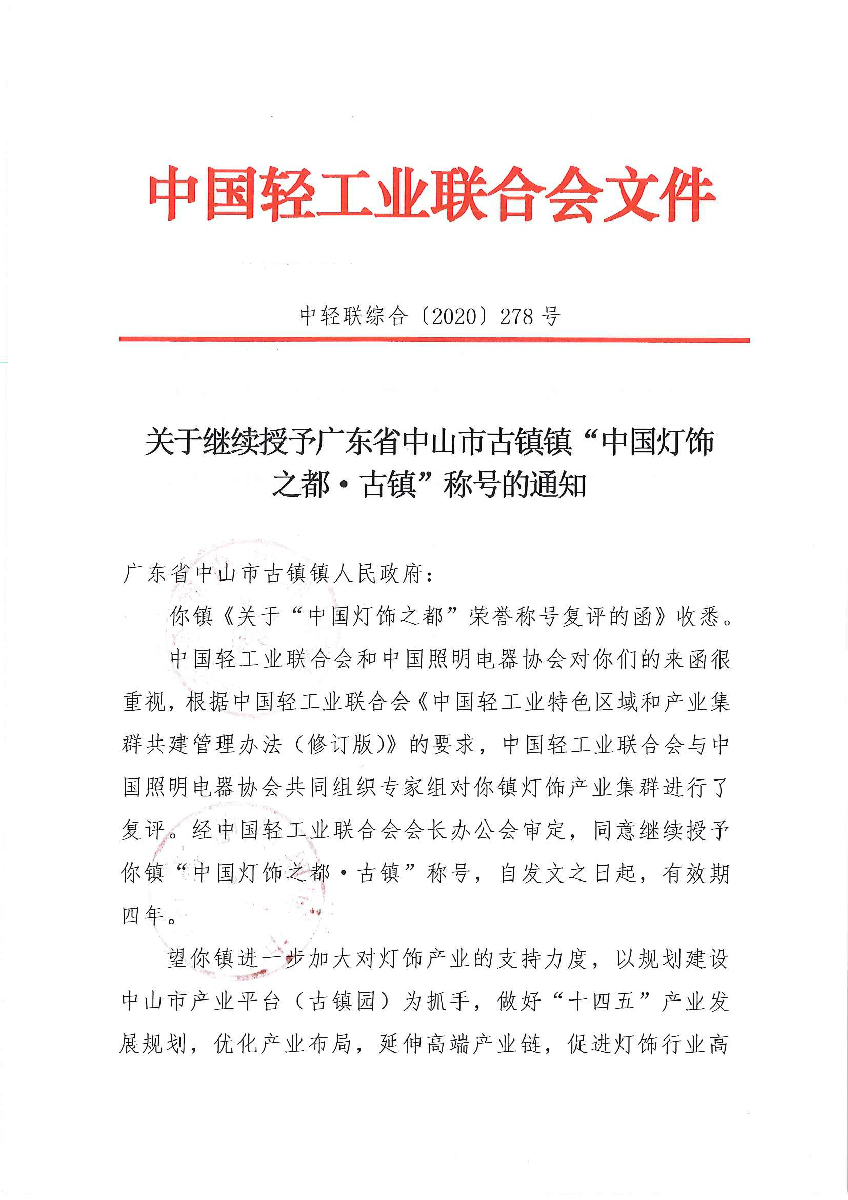 关于继续授予广东省中山市古镇镇“中国灯饰之都·古镇”称号的通知