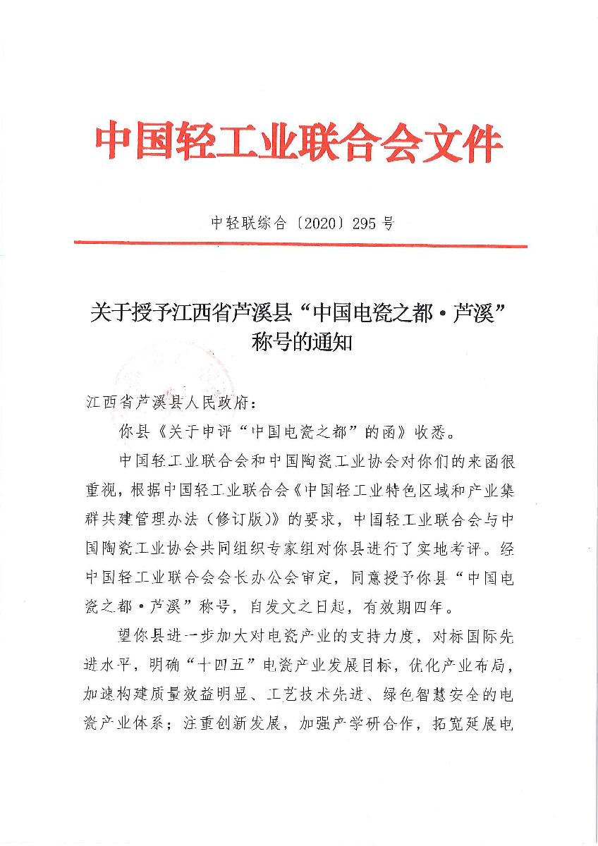 关于授予江西省芦溪县“中国电瓷之都·芦溪”称号的通知