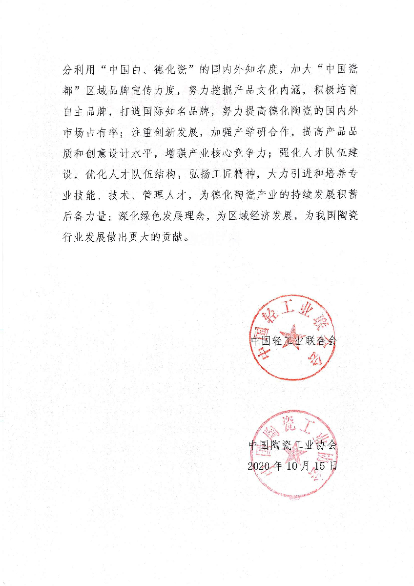 关于继续授予福建省德化县“中国瓷都·德化”称号的通知