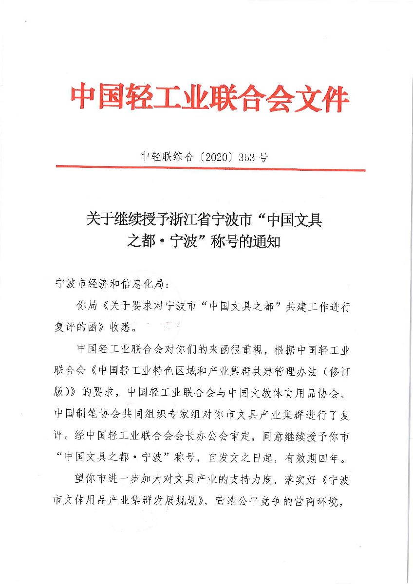 关于继续授予浙江省宁波市“中国文具之都·宁波”称号的通知