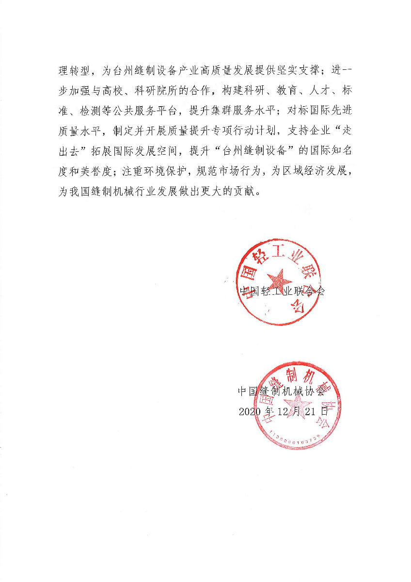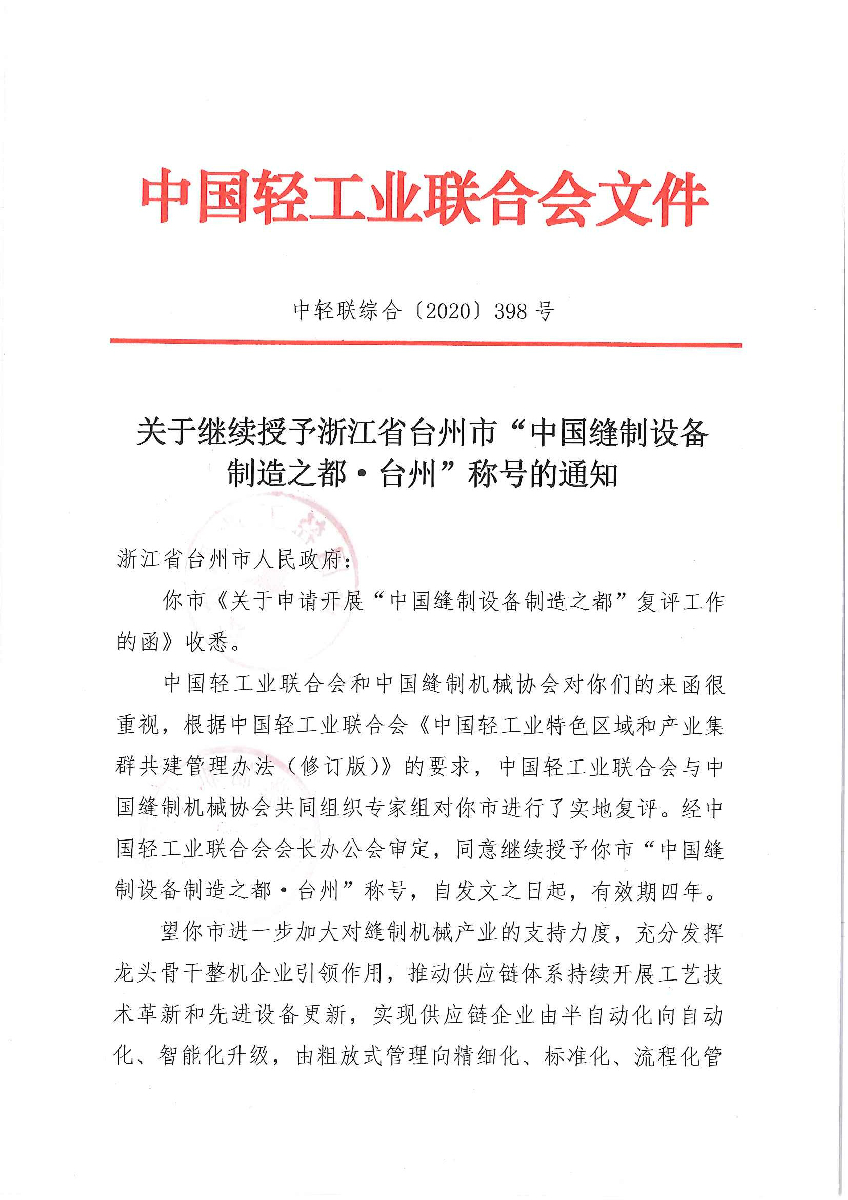 关于继续授予浙江省台州市“中国缝制设备制造之都·台州”称号的通知