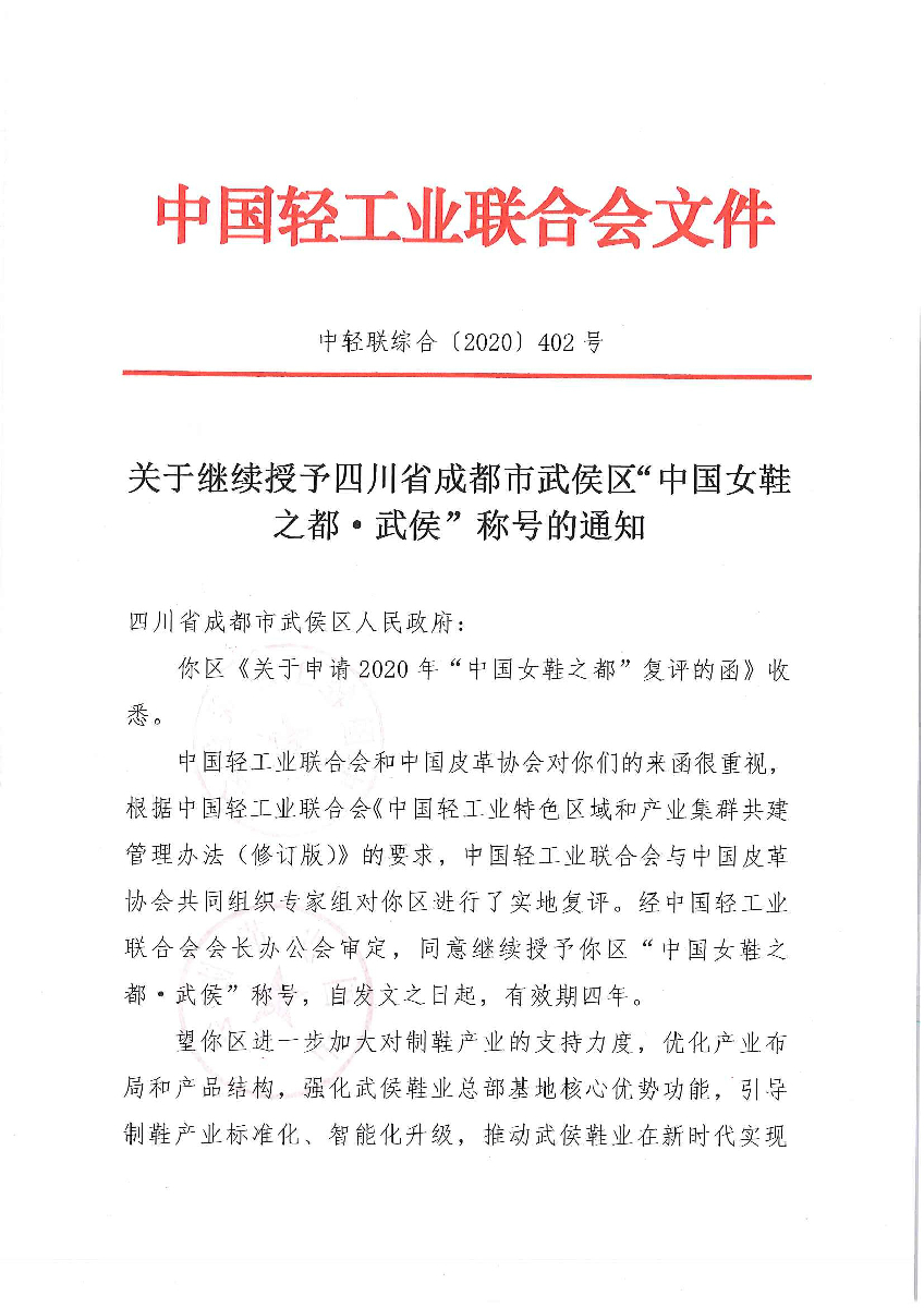 关于继续授予四川省成都市武侯区“中国女鞋之都·武侯”称号的通知