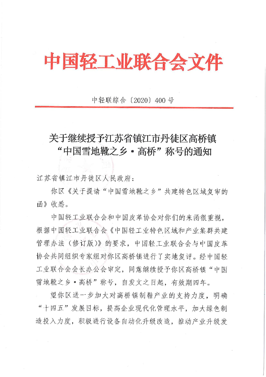 关于继续授予江苏省镇江市丹徒区高桥镇“中国雪地靴之乡·高桥”称号的通知
