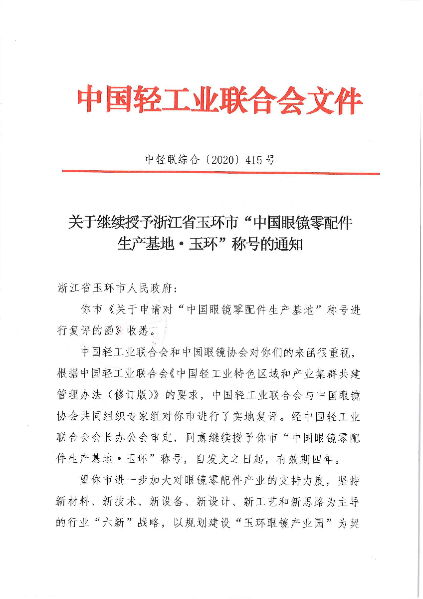 关于继续授予浙江省玉环市“中国眼镜零配件生产基地·玉环”称号的通知
