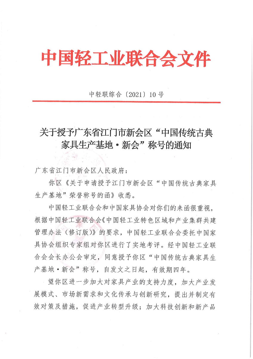 关于授予广东省江门市新会区“中国传统古典家具生产基地·新会”称号的通知