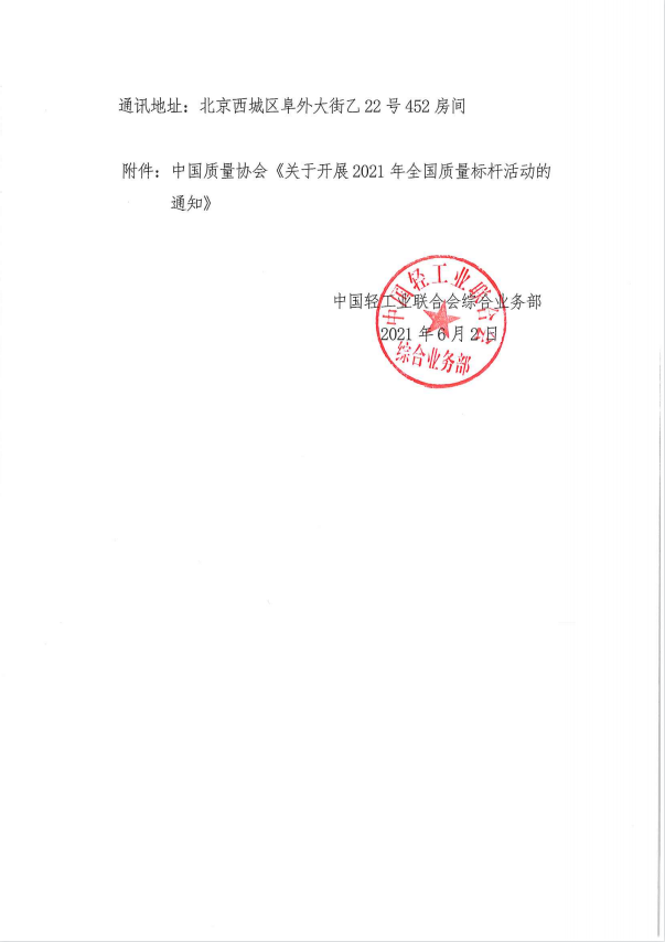 关于开展轻工领域2021年全国质量标杆申报工作的通知