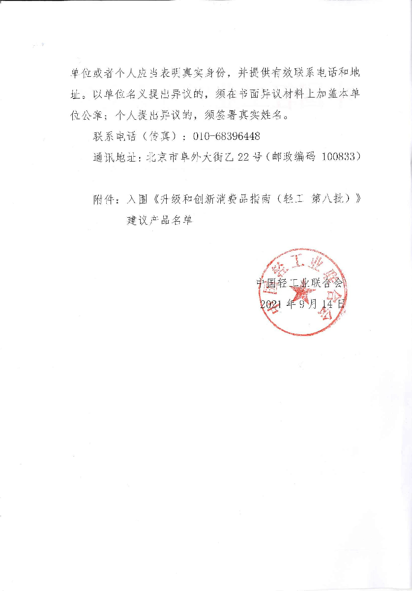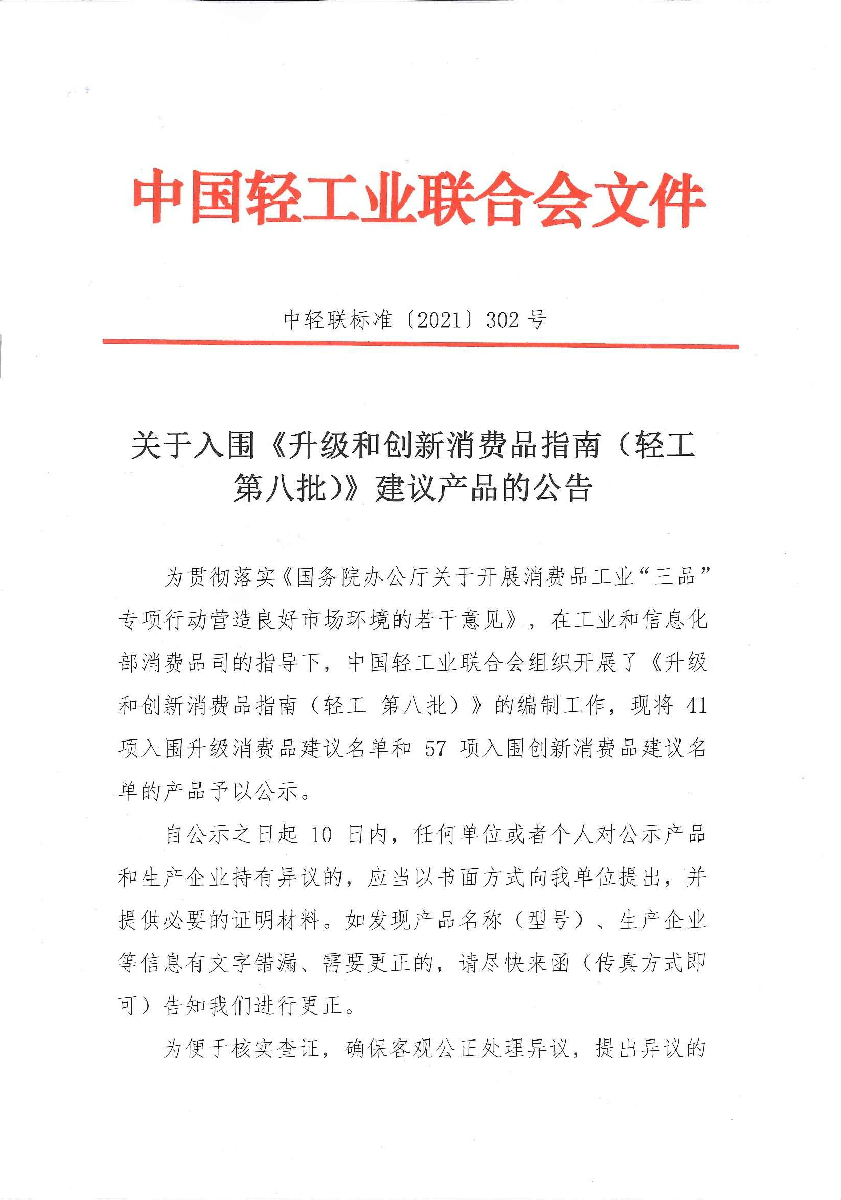 关于入围《升级和创新消费品指南(轻工 第八批)》建议产品的公告