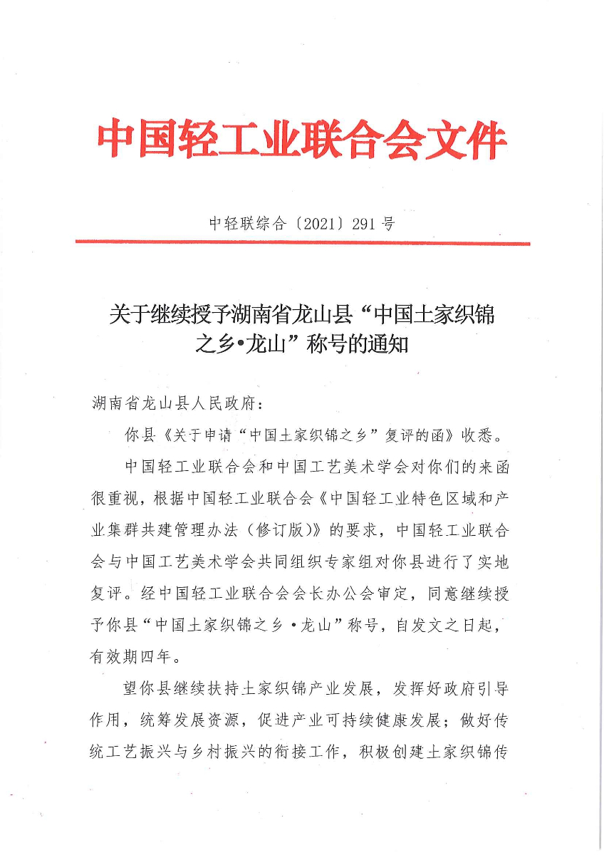 关于继续授予湖南省龙山县“中国土家织锦之乡•龙山”称号的通知
