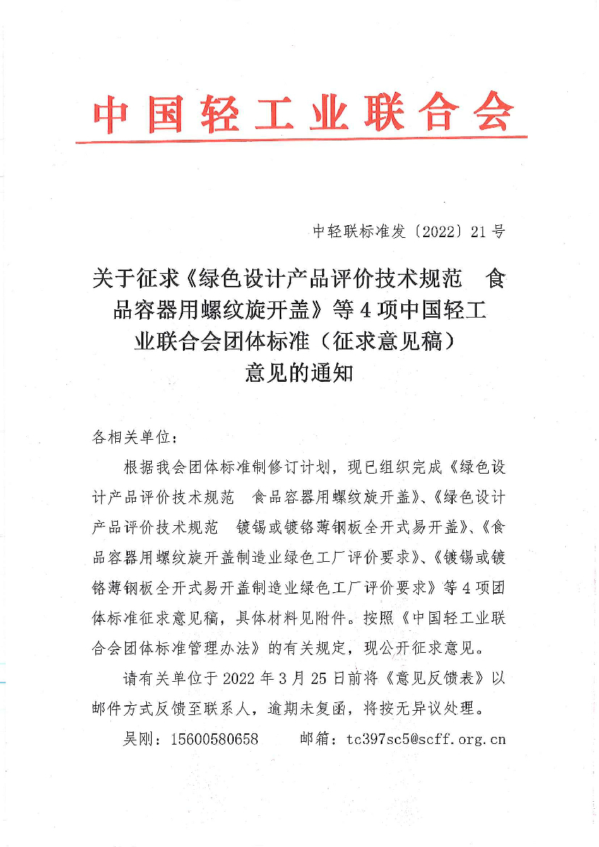 关于征求《绿色设计产品评价技术规范 食品容器用螺纹旋开盖》等4项bv伟德国际体育1946团体标准(征求意见稿)意见的通知