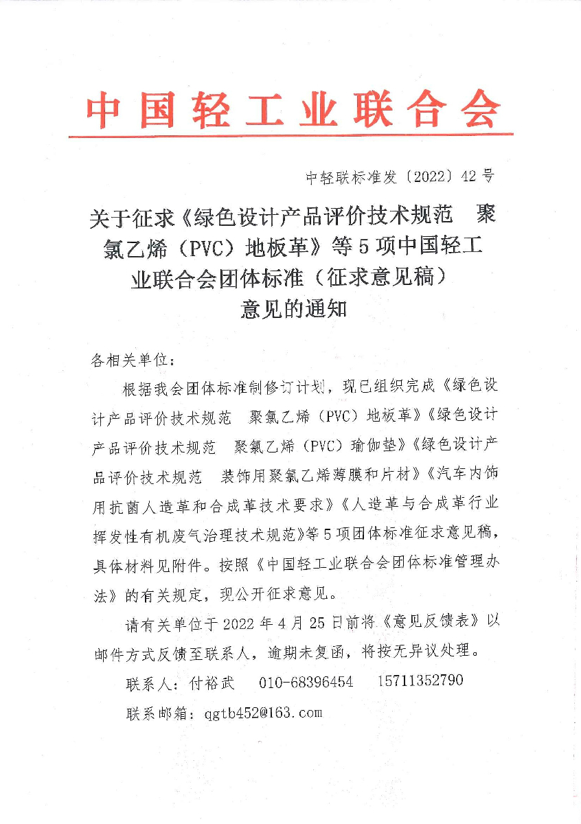 | 1、 | 1-1《绿色设计产品评价技术规范 聚氯乙烯(PVC)地板革》(征求意见稿) |