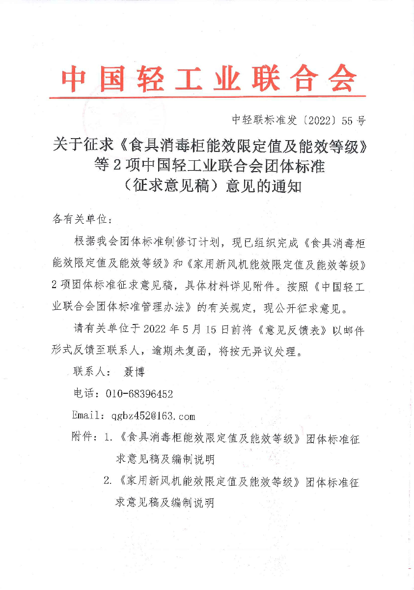 关于征求《食具消毒柜能效限定值及能效等级》等2项bv伟德国际体育1946团体标准(征求意见稿)意见的通知