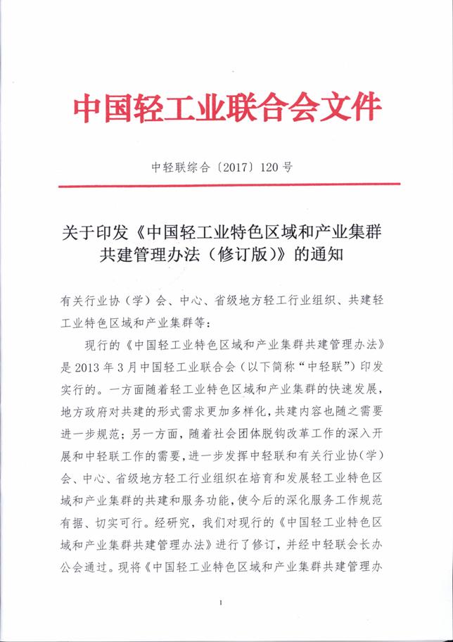 关于印发《中国轻工业特色区域和产业集群共建管理办法(修订版)》的通知