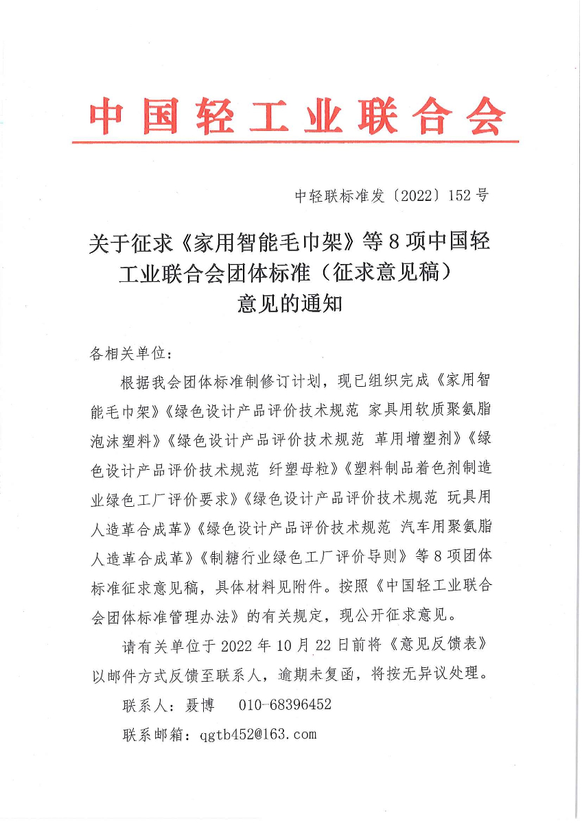 | 13、 | 《绿色设计产品评价技术规范 汽车用聚氨酯人造革合成革》团体标准(征求意见稿) |