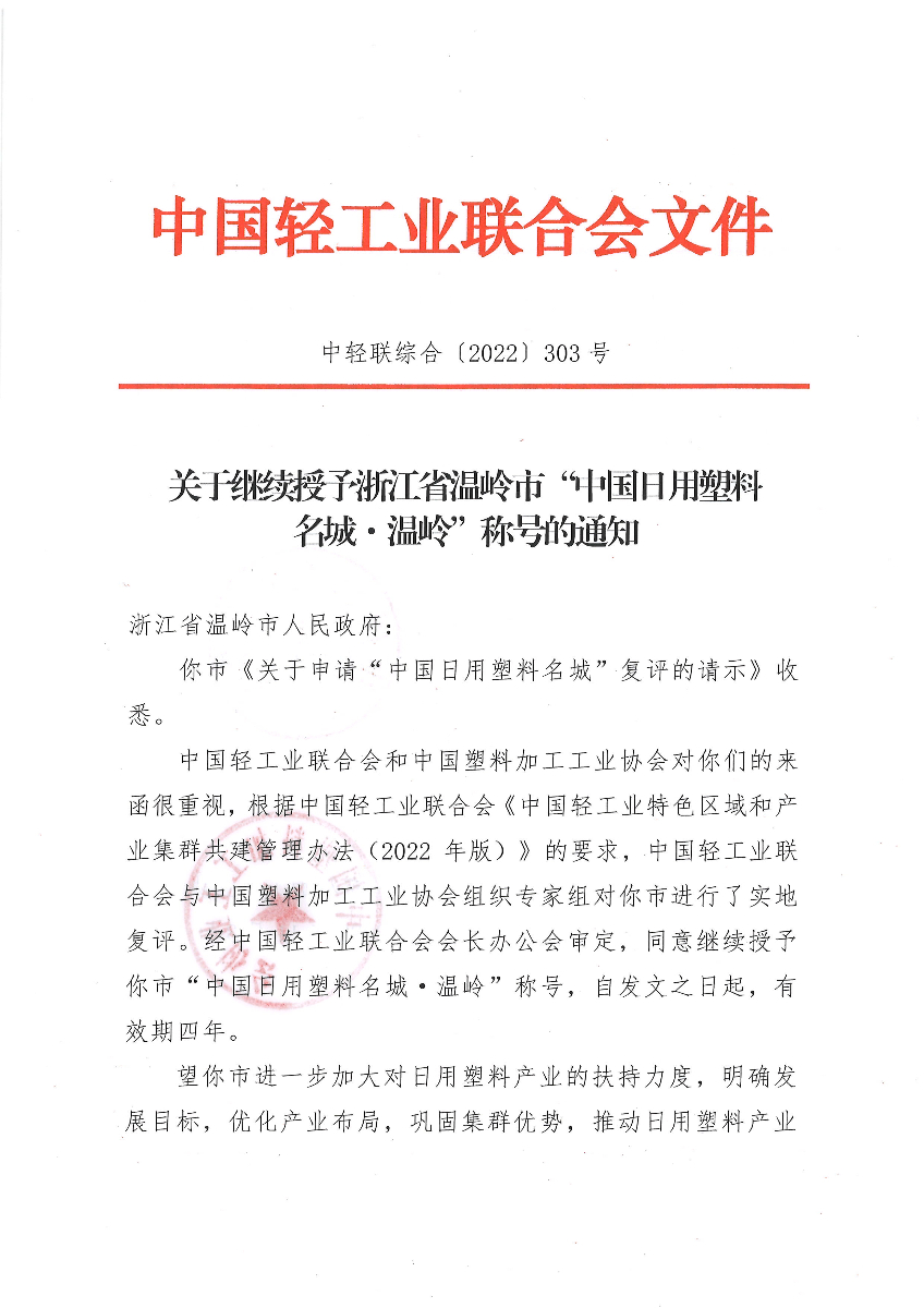 关于继续授予浙江省温岭市“中国日用塑料名城·温岭”称号的通知