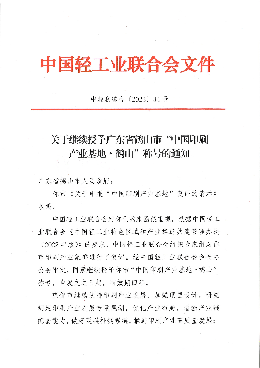关于继续授予广东省鹤山市“中国印刷产业基地·鹤山”称号的通知