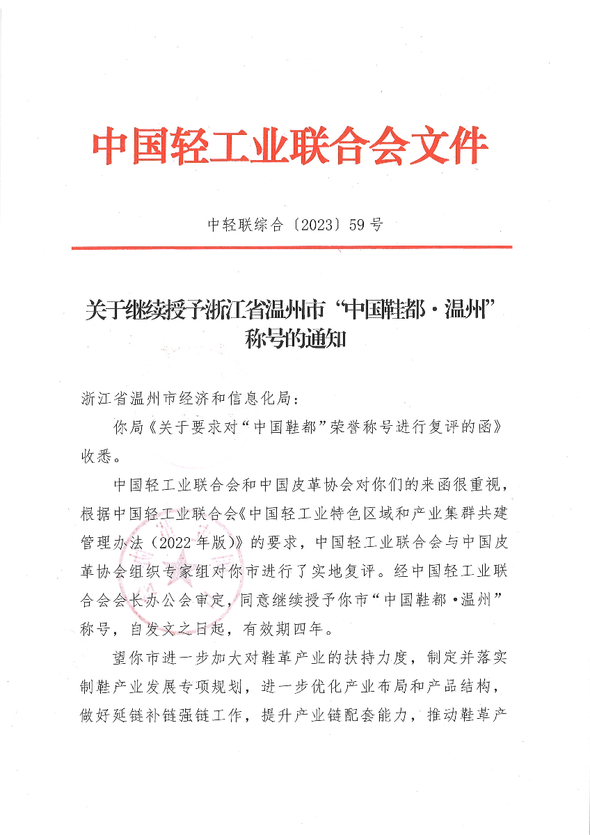 关于继续授予浙江省温州市“中国鞋都·温州”称号的通知