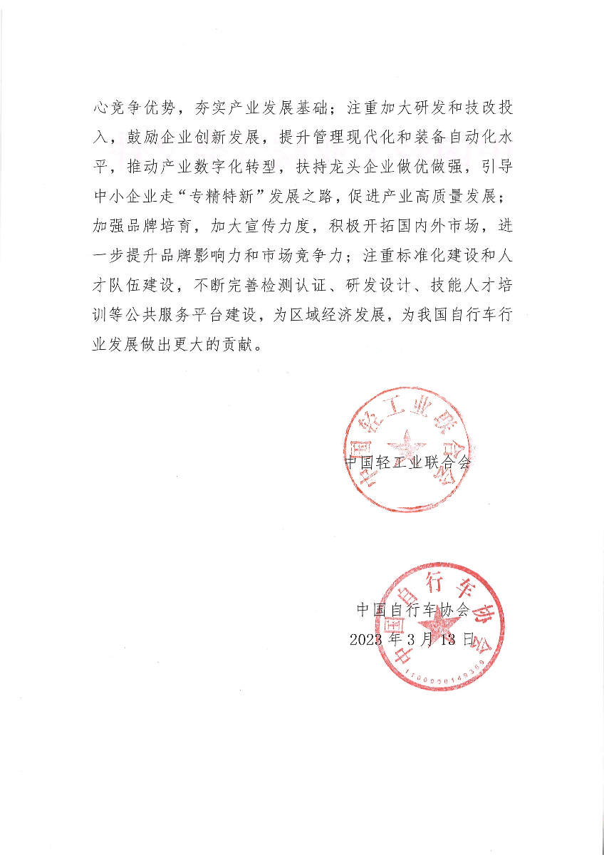 关于授予浙江省慈溪市胜山镇“中国自行车零部件产业基地·胜山”称号的通知
