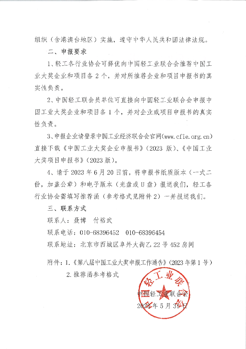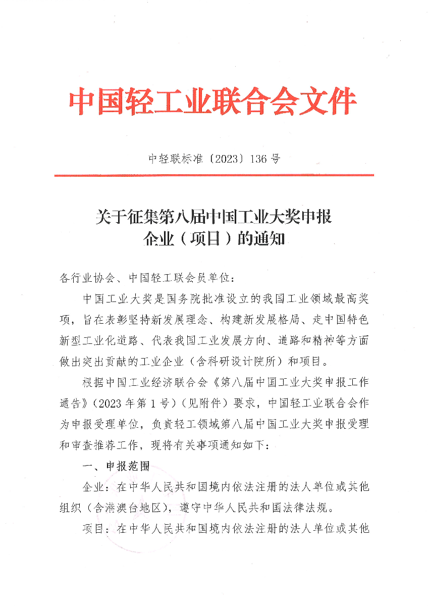 第八届中国工业大奖申报工作通告(2023年第1号)