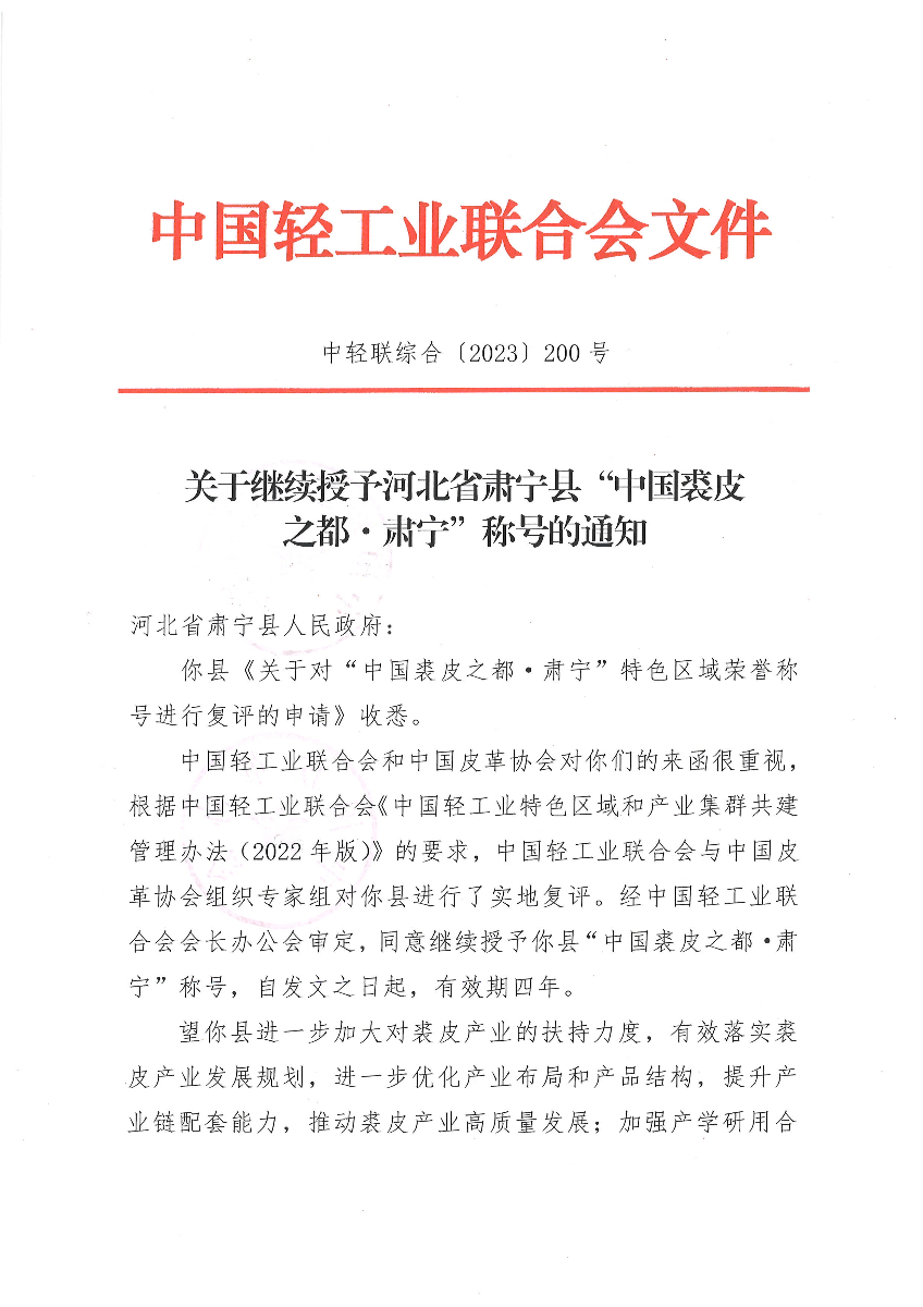 关于继续授予河北省肃宁县“中国裘皮之都·肃宁”称号的通知