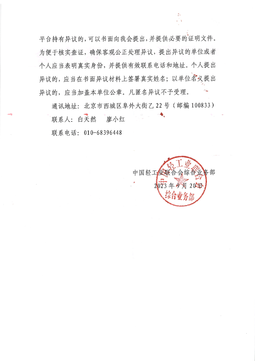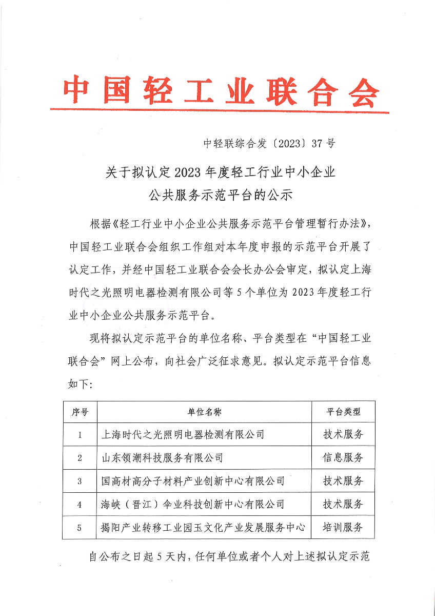关于拟认定2023年度轻工行业中小企业公共服务示范平台的公示