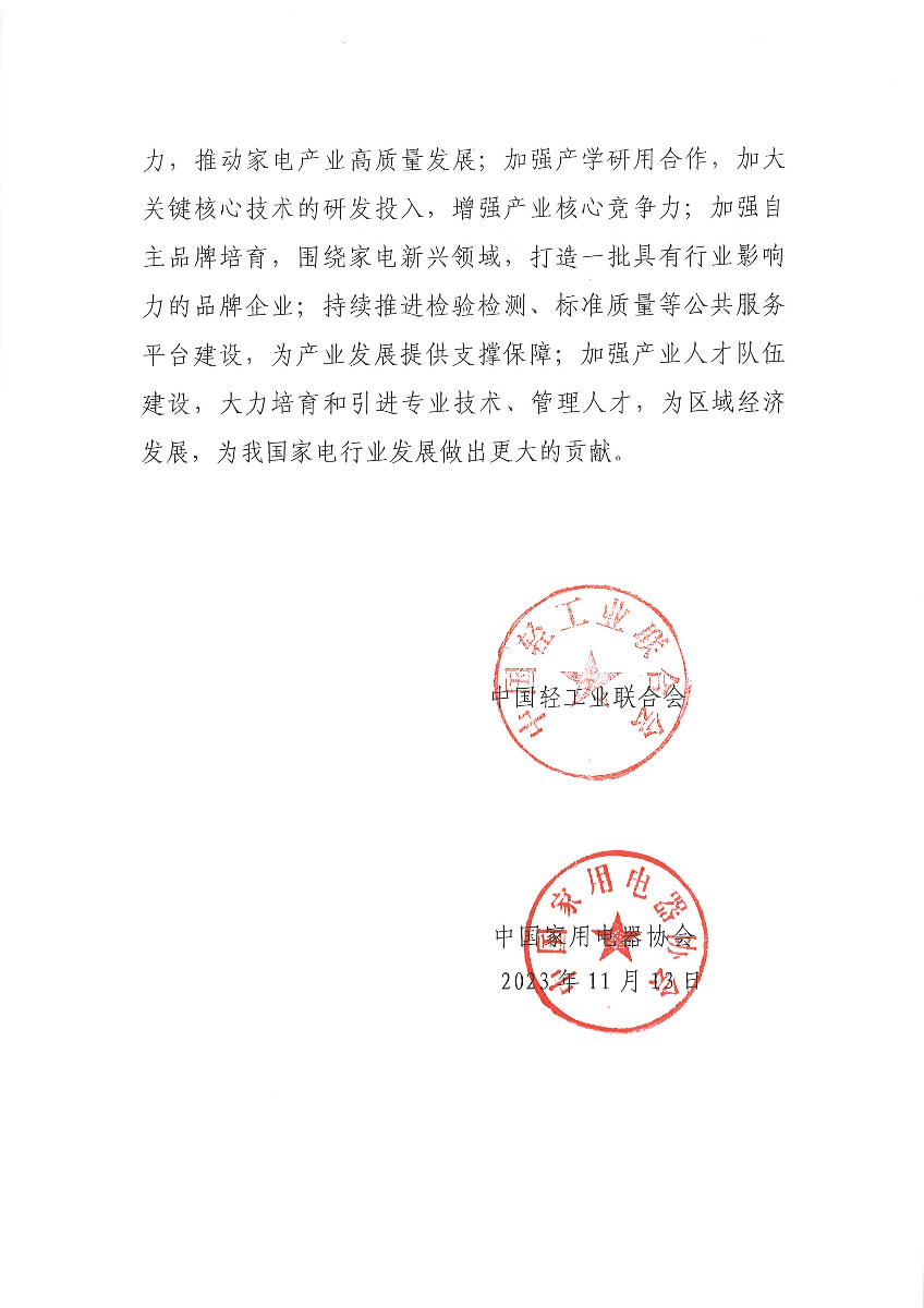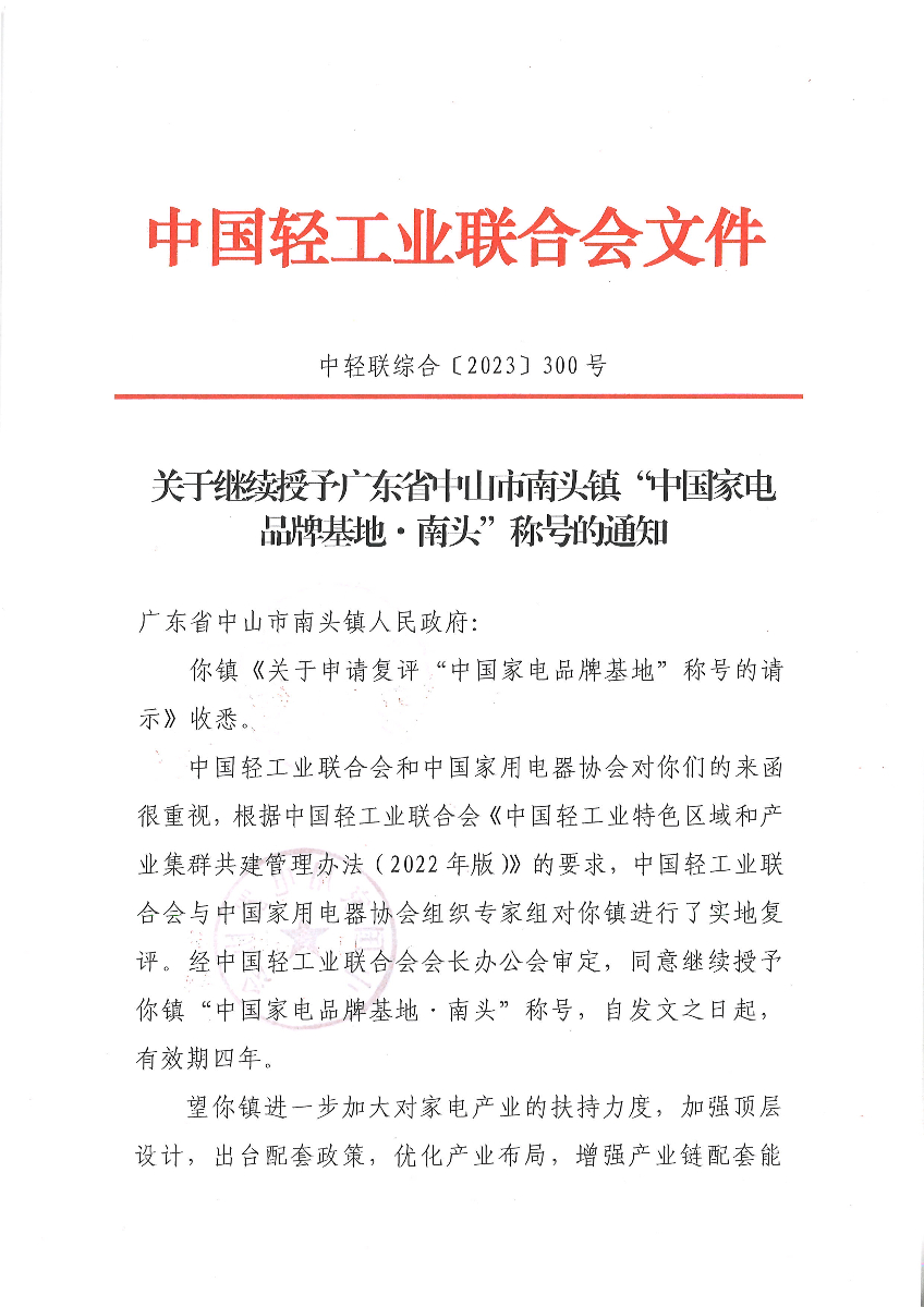 关于继续授予广东省中山市南头镇“中国家电品牌基地·南头”称号的通知