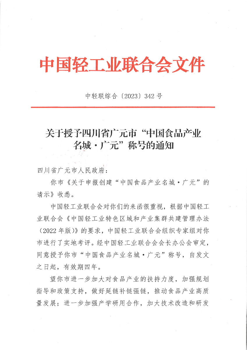 关于授予四川省广元市“中国食品产业名城·广元”称号的通知