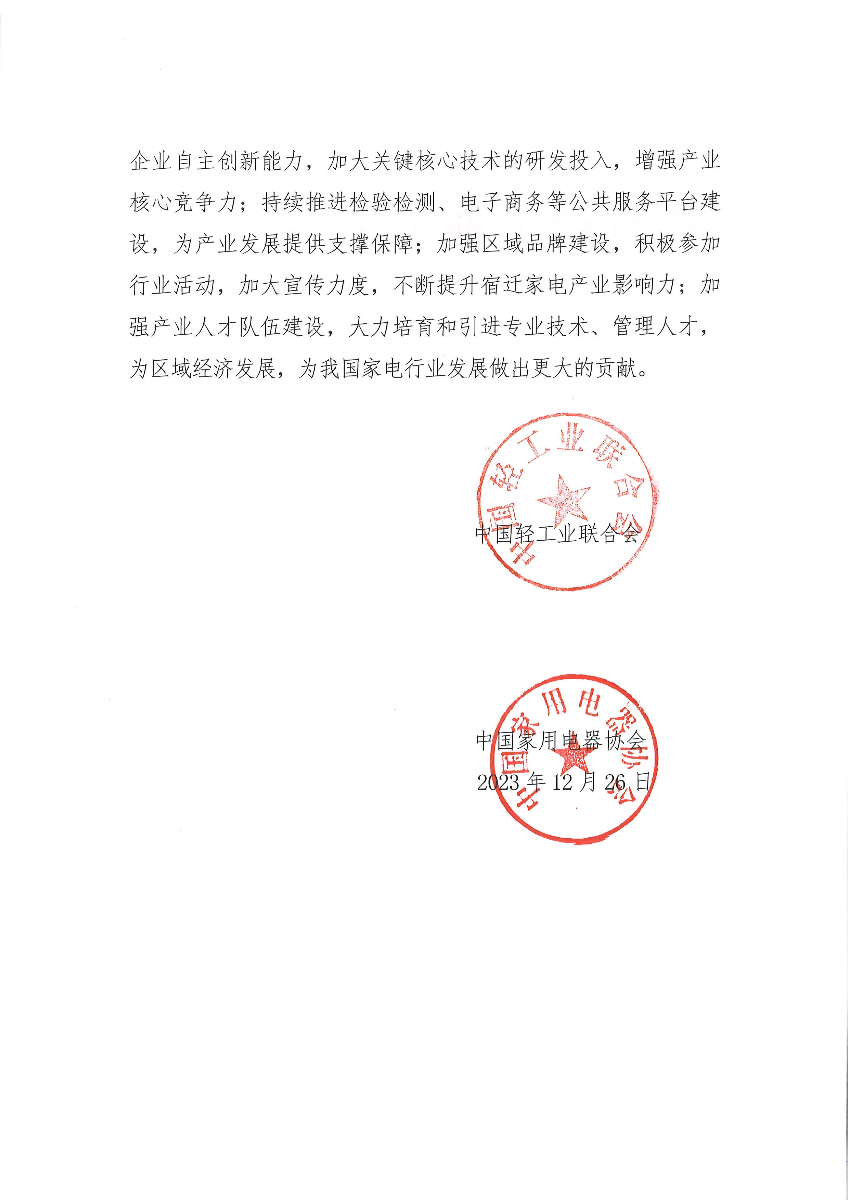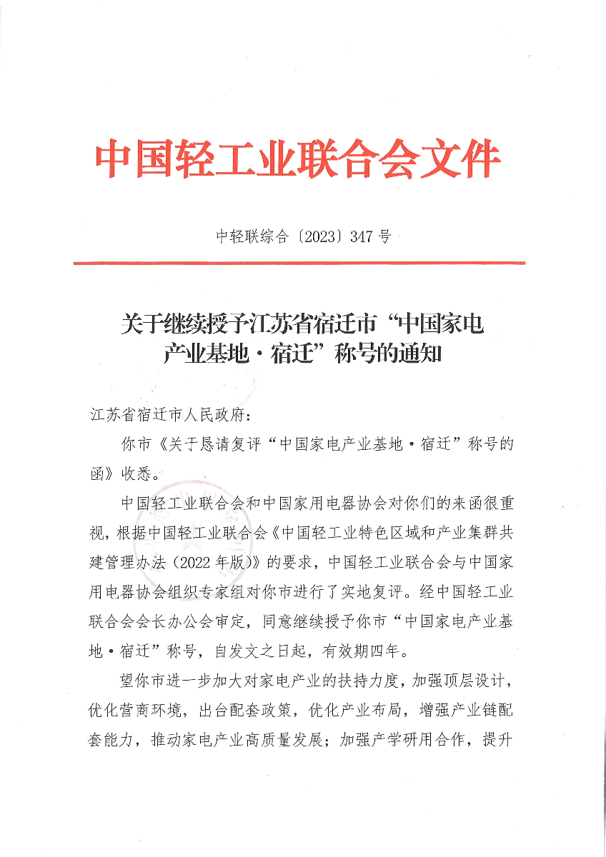 关于继续授予江苏省宿迁市“中国家电产业基地·宿迁”称号的通知