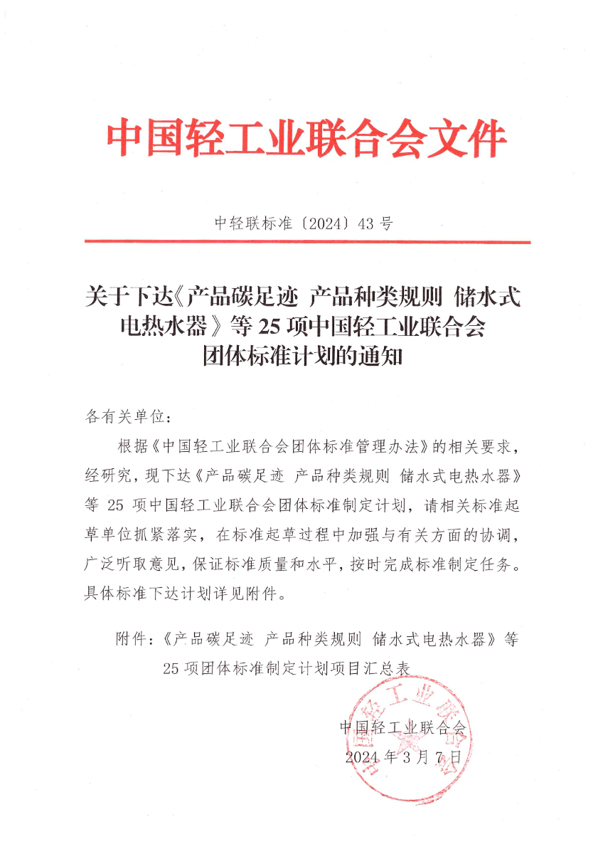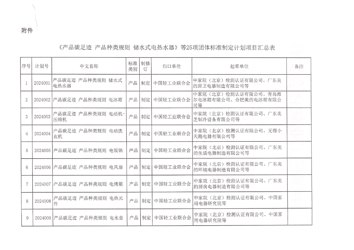 关于下达《产品碳足迹 产品种类规则 储水式电热水器》等25项bv伟德国际体育1946团体标准计划的通知
