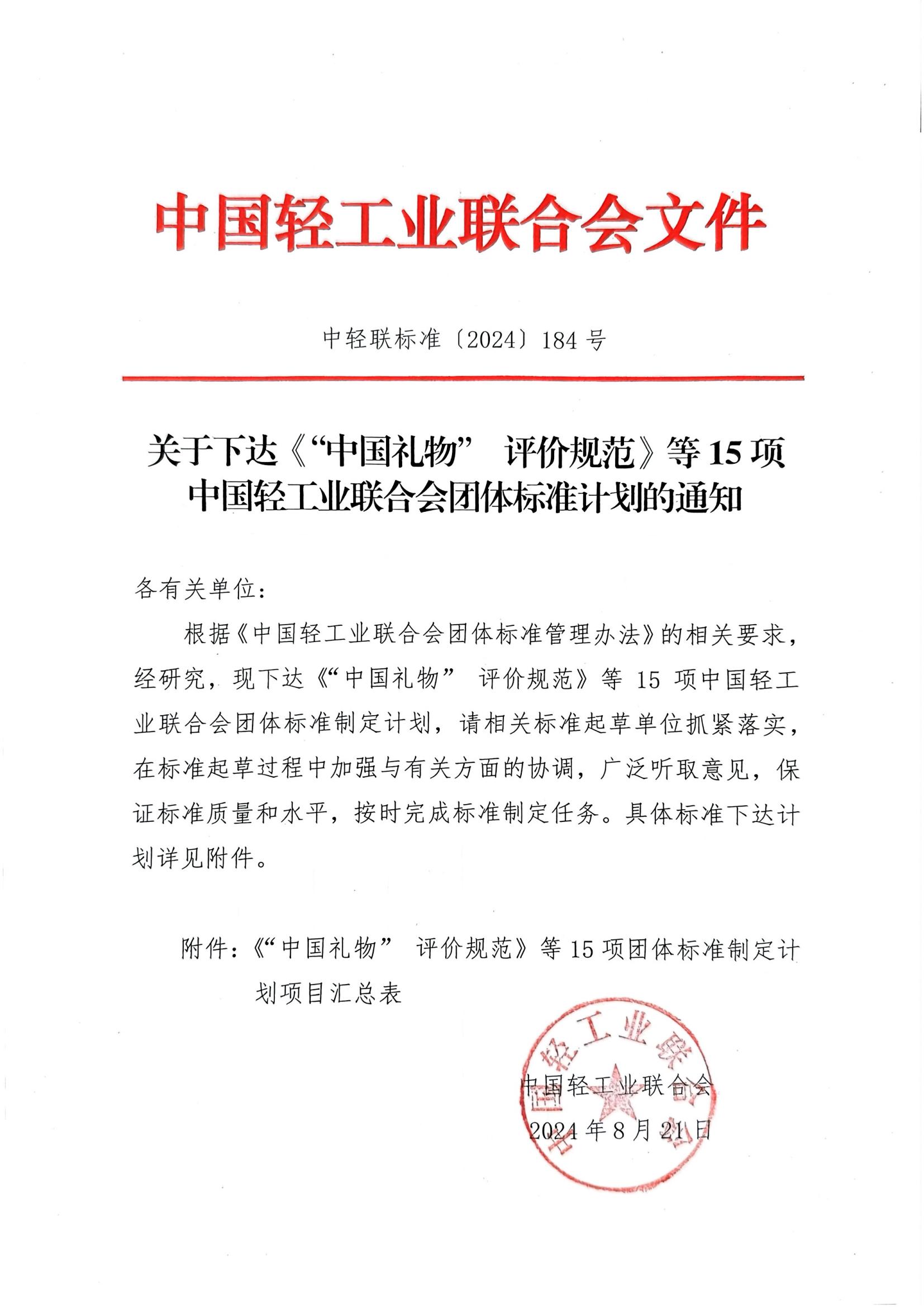 关于下达《“中国礼物”评价规范》等15项bv伟德国际体育1946团体标准计划的通知