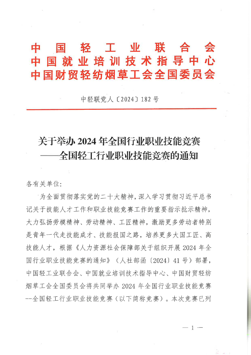 2024.08.15 中轻联党人〔2024〕182号 关于举办2024年全国轻工行业职业技能竞赛的通知.pdf