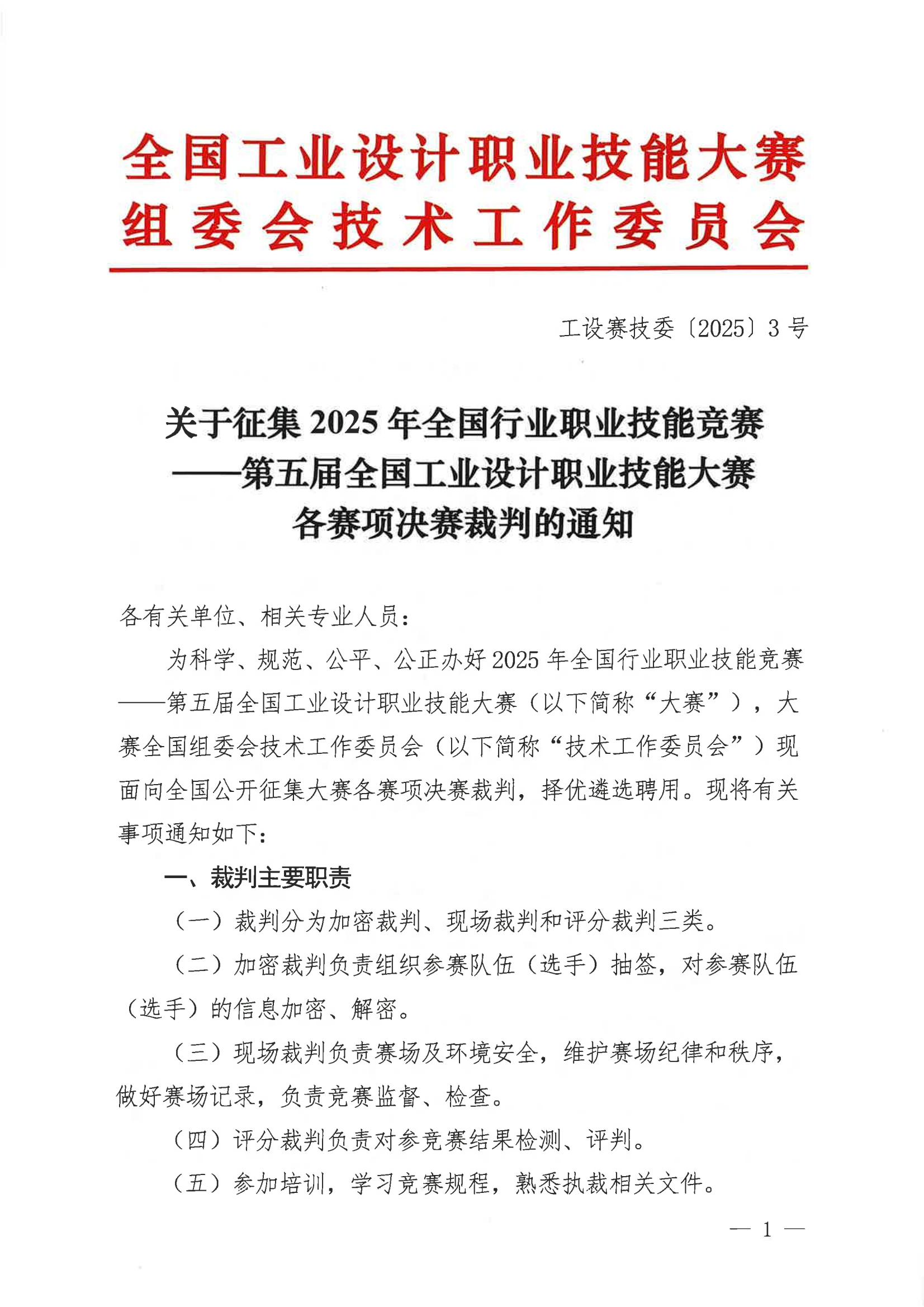 关于征集2025年全国行业职业技能竞赛第五届全国工业设计职业技能大赛各赛项决赛裁判的通知